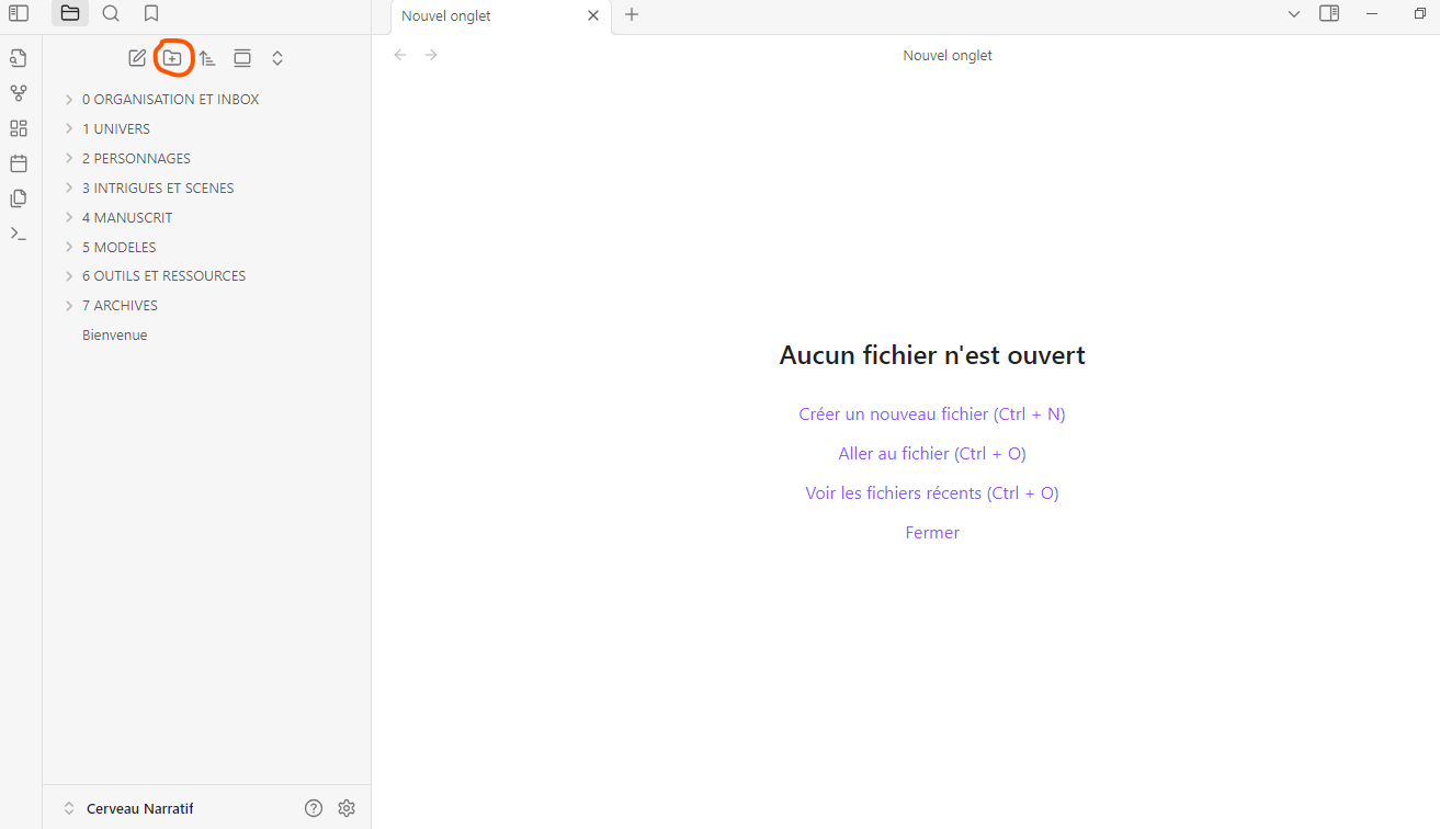 Après plusieurs essais et ajustement, voici la structure de base validée que j’utilise et que tu peux recréer facilement dans ton coffre Obsidian. Elle comporte 7 ou 8 dossiers principaux (tu peux ignorer « Manuscrit » si tu n’écris pas encore ton roman directement dans Obsidian) :